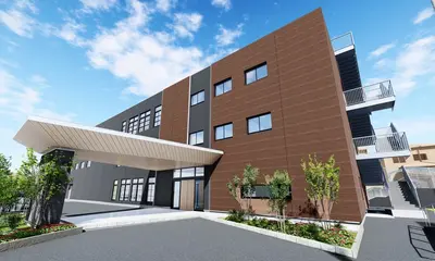 建物は南欧風ペンションをイメージしたデザインで、介護施設らしさを抑えた落ち着いた外観です。